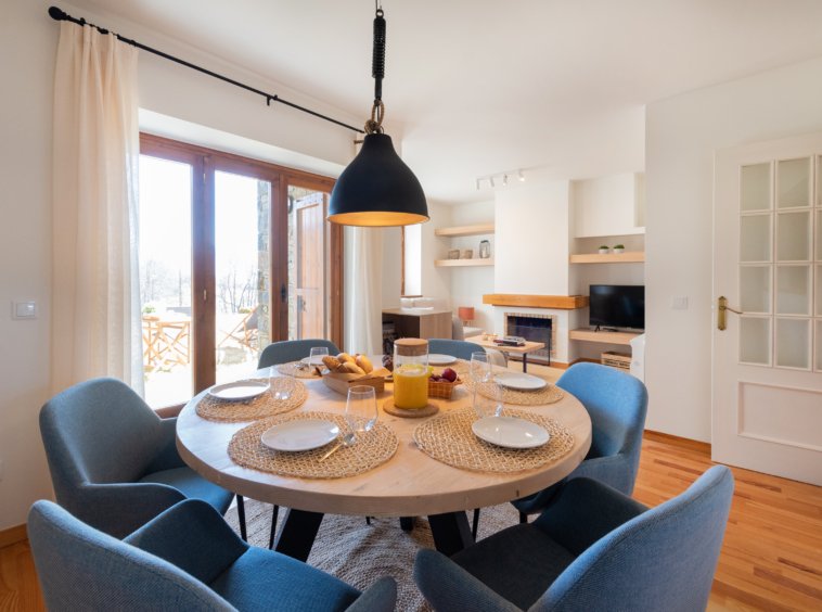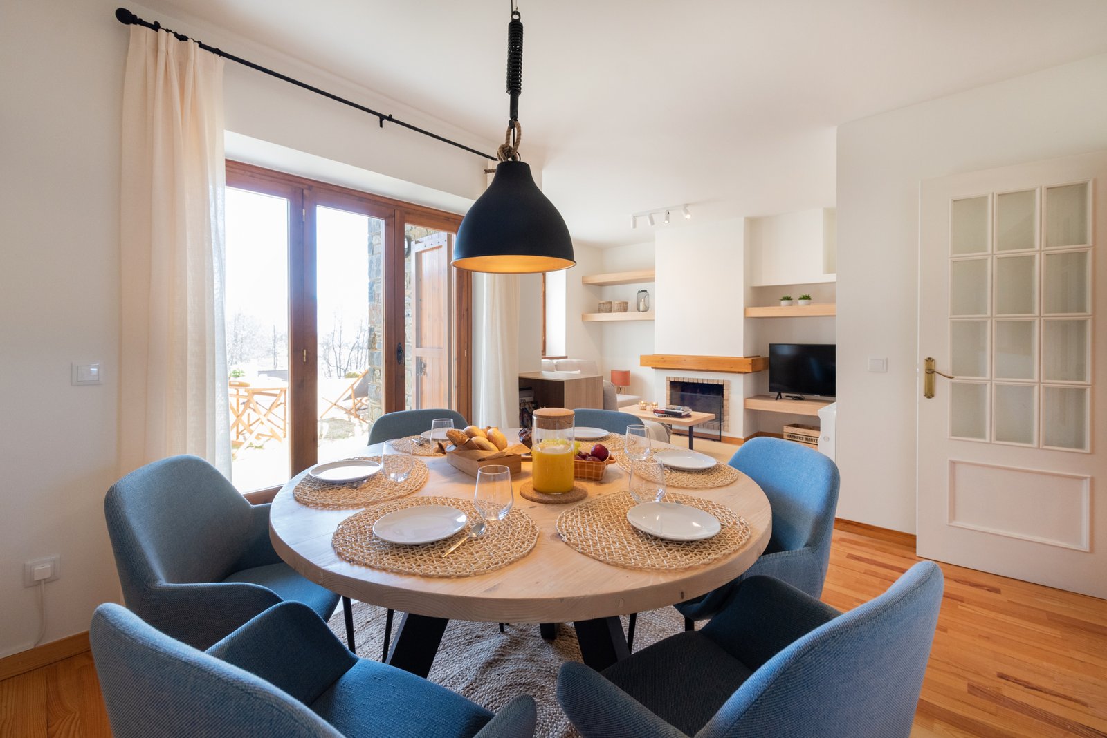 Luminoso salón-comedor con chimenea y salida al jardín.